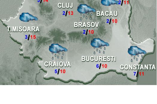 Temperaturile maxime se vor încadra între 8 şi 15 grade, cu cele mai ridicate valori în vestul ţării, iar cele minime vor fi cuprinse între -2 grade în estul Transilvaniei şi 7 grade pe litoral. Cerul va fi mai mult noros în sudul, centrul şi estul ţării şi va prezenta înnorări temporare în celelalte regiuni. Va ploua în Oltenia, Muntenia şi Dobrogea, unde cantităţile de apă vor depăşi pe arii restrânse 20…25 l/mp, şi local, în general slab cantitativ şi în celelalte regiuni. La munte, în special în Carpaţii Meridionali şi de Curbură, precipitaţiile vor fi şi sub formă de lapoviţă şi ninsoare. Vântul va sufla slab şi moderat, cu intensificări în regiunile extracarpatice şi pe crestele montane, iar în sud-est, la rafală, se vor depăşi 50…55 km/h. Spre sfârşitul intervalului, izolat, se va semnala brumă în regiunile vestice, nordice şi centrale.