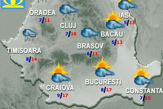 Cerul va avea înnorări temporare. Vor fi ploi slabe sau burniţe local în regiunile intracarpatice, iar noaptea pe arii restrânse şi în celelalte zone. Vântul va fi slab şi moderat, cu intensificări locale îndeosebi în regiunile estice şi în extremitatea de sud-vest, iar în zona montană înaltă va sufla tare. Temperaturile maxime se vor încadra între 8 şi 18 grade, uşor mai ridicate în sud-vest, iar cele minime între 3 şi 12 grade. Îndeosebi dimineaţa şi noaptea, izolat va mai fi ceaţă.