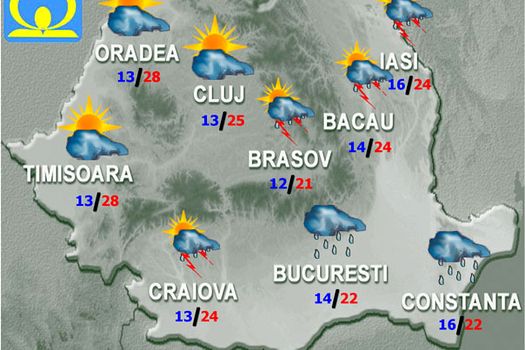 Vremea va fi în general instabilă în sudul, estul şi centrul ţării. Cantităţile de apă vor fi izolat mai însemnate, îndeosebi în sud-est şi în zona montană şi vor fi condiţii de grindină. În restul teritoriului cerul va fi variabil, cu ploi de scurtă durată în orele după-amiezei la munte. Vântul va avea intensificări pe litoral, dar de scurtă durată şi în celelalte zone, asociat averselor. Temperaturile maxime vor fi cuprinse între 19 şi 28 de grade, cu cele mai ridicate valori în Câmpia de Vest. Minimele termice se vor încadra între 8 şi 18 grade.