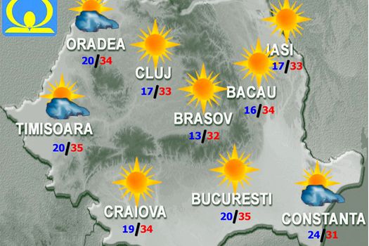 Vremea va fi călduroasă, local caniculară după-amiaza în regiunile vestice şi sudice şi izolat în cele centrale. Cerul va avea unele înnorări la munte şi în vest, unde izolat vor fi averse, posibil însoţite de descărcări electrice, în timp ce în restul ţării va fi variabil la senin. Vântul va sufla slab şi moderat, cu uşoare intensificări în Dobrogea. Temperaturile maxime se vor încadra în general între 31 şi 35 de grade, iar cele minime între 10…11 grade în depresiunile Carpaţilor Orientali şi 25 de grade pe litoral.