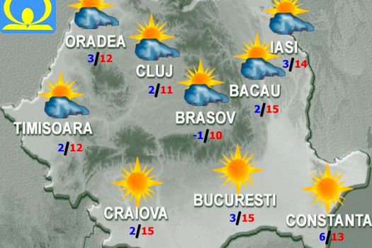 Pe parcursul zilei va predomina un aspect frumos, cu cer variabil la senin. Noaptea înnorările vor cuprinde nordul, centrul şi estul teritoriului; se vor semnala precipitaţii slabe, sub formă de ninsoare local în zona montană şi ploi sau lapoviţă pe arii restrânse în Maramureş, Transilvania şi Moldova. Vântul va sufla slab şi moderat, cu intensificări la munte, mai ales pe creste, trecător în regiunile sudice, iar în a doua parte a nopţii în Moldova. Temperaturile maxime se vor încadra între 8 şi 16 grade, iar cele minime între -3 şi 6 grade. Pe suprafeţe mici, mai ales în orele dimineţii, vor mai fi condiţii de brumă.