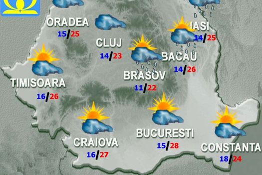 Vremea va deveni instabilă, iar valorile termice vor scădea în cea mai mare parte a ţării, dar mai ales în jumătatea de nord, unde se vor situa sub normele climatologice ale datei. În regiunile vestice, sud-vestice, centrale şi nordice, cerul va fi mai mult noros, va ploua mai ales sub formă de aversă şi trecător se vor semnala descărcări electrice. În sud-estul şi sudul extrem, înnorările se vor accentua mai ales spre orele serii şi în cursul nopţii, când vor fi frecvente descărcări electrice, intensificări ale vântului şi local averse. Ploile vor avea şi caracter torenţial şi izolat va cădea grindină. Temperaturile maxime vor fi cuprinse, în general, între 18 şi 27 de grade, iar cele minime se vor situa între 10 grade în depresiunile Carpaţilor Orientali şi nordul Moldovei şi 19 grade pe litoral.