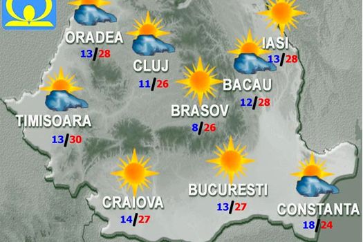Vor fi condiţii de grindină şi izolat se vor înregistra cantităţi de apă însemnate. Valorile termice diurne vor marca o scădere accentuată faţă de ziua precedentă în Câmpia şi Dealurile de Vest, unde vor ajunge să caracterizeze o vreme răcoroasă pentru această dată, în timp ce în restul teritoriului acestea se vor menţine apropiate de limitele normale ale acestei perioade. Astfel, temperaturile maxime se vor încadra între 18 şi 31 de grade, iar minimele termice vor fi cuprinse în general între 10 şi 20 de grade.