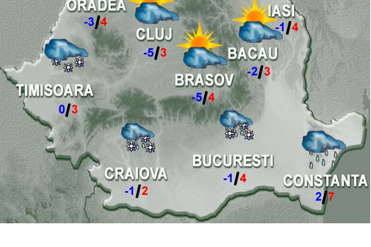 Marţi, vremea va continua să se răcească, îndeosebi în regiunile extracarpatice. În sud-vestul şi sudul ţării cerul va fi mai mult noros şi vor cădea precipitaţii pe arii relativ extinse. În cursul zilei acestea vor fi sub formă de ninsoare în Banat, mixte în Oltenia şi Muntenia şi mai ales ploi în Dobrogea, iar noaptea vor predomina ninsorile. În sud-vestul ţării cantităţile de apă vor depăşi izolat 15...20 l/mp, iar stratul de zăpadă nou depus va fi mai consistent.