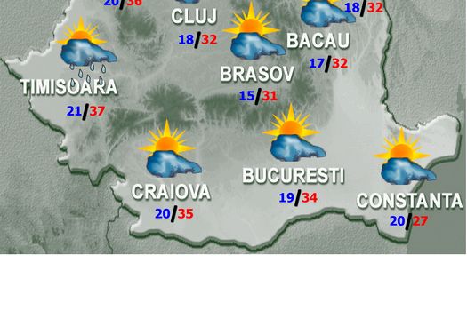 Temperaturile maxime se vor încadra între 25…28 de grade pe litoral şi 37 de grade în Banat. Minimele termice vor fi cuprinse între 12 grade în depresiunile Carpaţilor Orientali şi 24…25 de grade în Dealurile de Vest. Cerul va fi variabil, cu unele înnorări în a doua parte a zilei la munte unde pe arii restrânse vor fi ploi de scurtă durată şi descărcări electrice.