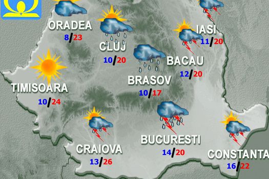 Cerul va fi variabil în vest, dar va avea înnorări temporar accentuate, mai ales în cursul zilei, în celelalte regiuni. Local în centru, sud şi est şi izolat în rest vor mai fi averse şi descărcări electrice, iar cantităţile de apă vor depăşi punctiform 20…25 l/mp. Vântul va avea unele intensificări în Dobrogea, iar în cursul zilei şi în estul şi sud-vestul teritoriului. Temperaturile maxime se vor situa între 16…17 grade în Transilvania şi în Subcarpaţii Getici şi 27 de grade în sudul Olteniei, iar temperaturile minime vor fi cuprinse, în general, între 6 şi 16 grade.