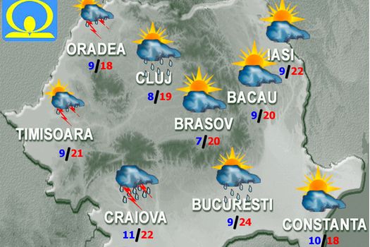 Vremea va fi caldă, miercuri, dar va deveni treptat în general instabilă. În cursul zilei cerul va fi variabil, cu înnorări şi ploi de scurtă durată în zonele de deal şi de munte. Noaptea vor fi averse, descărcări electrice şi intensificări de scurtă durată ale vântului, pe arii relativ extinse în regiunile sudice precum şi în zona Carpaţilor Meridionali, unde se pot cumula cantităţi de apă mai însemnate. Vor fi condiţii de grindină. În restul teritoriului, fenomenele asociate instabilităţii atmosferice pot fi doar la nivel local. Temperaturile maxime se vor încadra între 19 şi 26 de grade, uşor mai mici pe litoral, iar cele minime între 7 şi 14 grade.