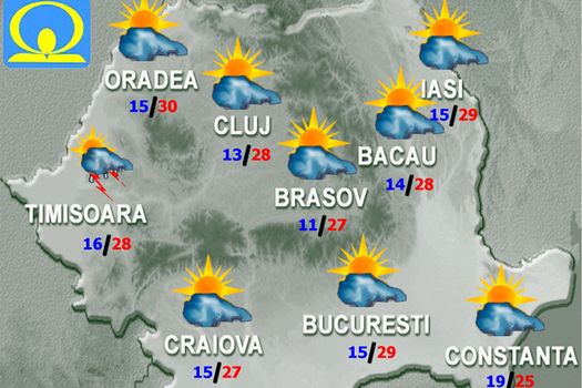 Valorile termice vor caracteriza în continuare o vreme caldă pentru această perioadă din an în cea mai mare parte a ţării. Cerul va fi variabil, cu înnorări temporare în regiunile sud-vestice, unde pe arii restrânse vor fi averse şi descărcări electrice, dar şi în extremitatea de sud-est, unde doar trecător şi izolat va ploua slab.