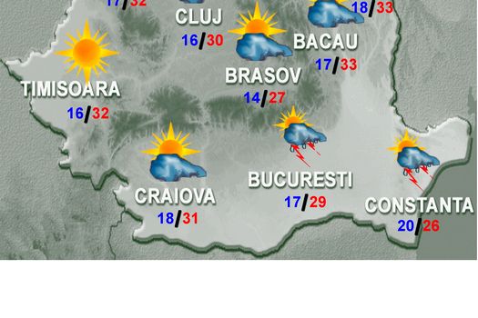 Ploi de scurtă durată vor fi posibile şi în sudul Moldovei şi în estul Olteniei. Temperaturile maxime se vor încadra între 27 şi 34 de grade, uşor mai mici pe litoral; minimele termice vor fi cuprinse, în general, între 11 şi 21 de grade.