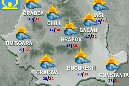 Vremea se va menţine călduroasă în cea mai mare parte a ţării. Disconfortul termic se va accentua, iar indicele temperatură-umezeală (ITU) se va afla în jurul valorii de 80 de unităţi, local, mai ales din vest, în sud şi în est. Temperaturile maxime se vor încadra între 28 şi 34 de grade. Cerul va fi variabil, cu înnorări temporar accentuate mai ales în a doua parte a zilei şi în prima partea nopţii. Vor fi averse, descărcări electrice şi intensificări de scurtă durată ale vântului, în sud-vestul ţării, în zonele de deal şi de munte, dar pe arii restrânse şi în restul teritoriului. Ploile vor avea şi caracter torenţial şi izolat va cădea grindină. Temperaturile minime vor fi cuprinse între 12 şi 24 de grade.