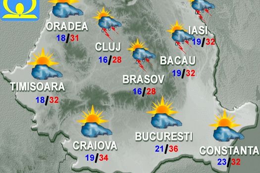 Temperaturile maxime se vor încadra între 28 şi 36 de grade, cu cele mai ridicate valori în Lunca Dunării, iar cele minime între 11 grade în depresiunile din estul Transilvaniei şi 25 de grade pe litoral. Cerul va fi variabil, iar la munte şi doar pe arii restrânse în rest, vor fi înnorări temporare, averse, descărcări electrice, intensificări de scurtă durată ale vântului şi condiţii de grindină.