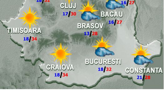 Vremea va fi călduroasă, caniculară după-amiaza în Oltenia, Banat, Crişana, local în Muntenia şi sud-vestul Transilvaniei, zone unde şi indicele temperatură umezeală va atinge şi depăşi uşor pragul de 80 al disconfortului termic. Temperaturile maxime vor fi cuprinse, în general, între 29 şi 36 de grade, cu cele mai ridicate valori în regiunile sud-vestice. Cerul va fi variabil spre mai mult senin, cu unele înnorări după-amiaza în zona Carpaţilor Orientali, unde izolat vor fi averse şi descărcări electrice. Vântul va sufla slab şi moderat. Temperaturile minime vor fi cuprinse între 10 grade în depresiunile din estul Transilvaniei şi 23…24 de grade în Dealurile de Vest.