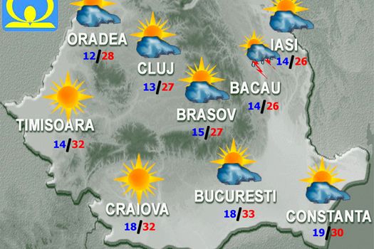Cerul va fi variabil, cu înnorări temporar accentuate şi mai ales în a doua parte a zilei şi noaptea se vor semnala averse, descărcări electrice şi intensificări de scurtă durată ale vântului, în regiunile nordice, estice şi la munte, local în centru şi pe arii mai restrânse în sud. Izolat cantităţile de apă pot depăşi 20 l/mp şi vor fi condiţii de grindină. Temperaturile maxime se vor încadra între 21 de grade în nordul Moldovei şi 34 de grade, izolat, în Oltenia şi în Muntenia. Temperaturile minime vor fi cuprinse, în general, între 10 şi 20 de grade.