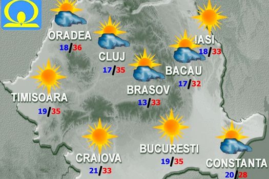 Vremea va fi călduroasă,  caniculară chiar în orele amiezii în zonele de câmpie şi podiş din vestul, nord-vestul, centrul si sudul ţării, unde disconfortul termic va fi accentuat, iar indicele temperatură-umezeală va atinge local şi izolat va depăşi pragului critic de 80 de unităţi. Temperaturile maxime vor fi cuprinse între 31 şi 37 de grade, mai scăzute pe litoral şi în Delta Dunării (25…28 de grade), iar cele minime se vor încadra între 14 şi 22 de grade, mai coborâte în estul Transilvaniei, spre 10…11 grade.