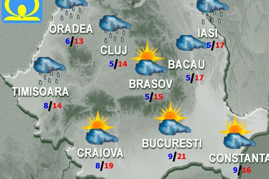 Temperaturile maxime se vor încadra între 11 şi 20 de grade, mai ridicate în Câmpia Română şi Podişul Dobrogei, până la 22…24 de grade, iar cele minime între 3 şi 11 grade. În vestul, nord-vestul şi centrul teritoriului cerul va fi mai mult noros, aria ploilor se va extinde treptat, iar izolat, mai ales în Banat şi la munte, se vor cumula peste 20 l/mp. În celelalte zone cerul va fi variabil, cu înnorări şi ploi locale, în general slabe, seara şi noaptea. Vor fi şi averse, iar izolat vor fi posibile descărcări electrice. În cursul nopţii, la munte, vor apărea precipitaţii mixte. Vântul va sufla slab şi moderat, cu unele intensificări în zona montană, izolat în sud-estul teritoriului, iar la sfârşitul intervalului şi în regiunile vestice.