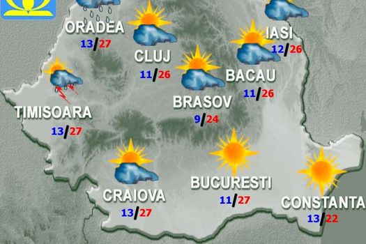 Cerul va fi variabil, cu înnorări temporar accentuate, averse şi descărcări electrice, îndeosebi după-amiaza şi în primele ore ale nopţii, în vestul şi nord-vestul ţării, zona de munte şi pe arii retrânse în centru şi nord-est. Izolat, cantităţile de apă vor depăşi 15…20 l/mp. Vor fi condiţii de grindină. Vântul va sufla slab şi moderat cu intensificări în Munţii Banatului, dar de scurtă durată şi în rest, în timpul ploilor.