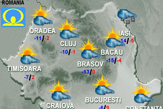 Vremea se menţine deosebit de rece pentru această dată, geroasă dimineaţa şi noaptea în nordul, nord-estul şi centrul ţării. Cerul va fi temporar noros şi vor fi precipitaţii slabe, predominant ninsori, local în vest şi izolat în centru şi sud-vest. Vântul va sufla slab şi moderat, cu unele intensificări ziua în est, iar noaptea în regiunile sudice. Temperaturile maxime vor avea valori de la -7 grade în nordul Moldovei până la 4…5 grade în sudul Olteniei şi al Banatului, iar cele minime se vor situa, în general, între -14 şi -4 grade.