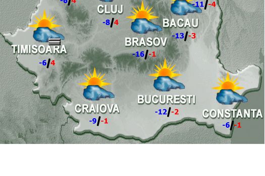 Vremea se va incălzi fată de ziua precedentă, astfel incat temperaturile maxime vor fi cuprinse intre -3 si 8 grade, iar cele minime se vor situa intre -10 si 0 grade, mai coborate in depresiunile din estul Transilvaniei, pană in jurul valorii de -14 grade. Cerul va fi variabil, cu innorări temporare in regiunile estice si sud-estice, unde pe arii restranse va ninge slab. In restul teritoriului doar izolat vor fi conditii de fulguială. Vantul va sufla slab si moderat, cu intensificări la munte, in Moldova, Dobrogea si doar izolat in restul teritoriului. In zonele joase de relief, local, va fi ceată.