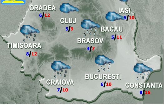 Vremea se va ameliora treptat sub aspectul precipitaţiilor, dar va rămâne deosebit de rece pentru această perioadă a anului. Temperaturile maxime se vor încadra între 6 şi 14 grade, iar cele minime între -1 şi 7 grade, mai scăzute în depresiuni, spre -4 grade. Cerul va fi temporar noros şi, îndeosebi în prima parte a intervalului, va mai ploua local în Dobrogea, Oltenia şi Muntenia şi pe arii restrânse în rest. În zonele montane precipitaţiile vor fi şi sub formă de lapoviţă şi ninsoare. Vântul va continua să prezinte intensificări în sud-estul ţării. Spre dimineaţă, în regiunile intracarpatice, local se va produce brumă şi izolat va fi ceaţă.