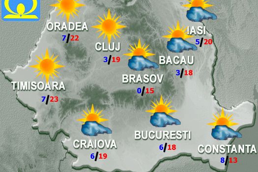 Vântul va avea unele intensificări în jumătatea sudică a Moldovei, Dobrogea şi Muntenia şi va fi în general slab în restul teritoriului. Temperaturile maxime vor fi cuprinse între 12 grade pe litoral şi 23 de grade în vest, iar cele minime se vor situa, în general, între 0 şi 10 grade.