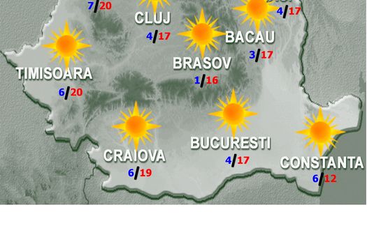 Cerul va fi variabil în regiunile nordice, nord-estice şi la munte şi mai mult senin în restul teritoriului. Vântul va sufla slab şi moderat, cu unele intensificări în zona montană înaltă. Temperaturile maxime se vor încadra între 11 şi 21 de grade, cu cele mai scăzute valori pe litoral, iar cele minime vor fi cuprinse între -3 grade în depresiunile Carpaţilor Orientali şi 10 grade în Dealurile de Vest. Pe arii restrânse, în Transilvania, dimineaţa şi noapte, va fi brumă.