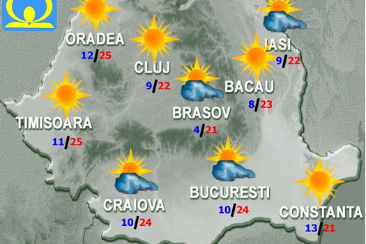 Vremea va fi frumoasă şi va intra într-un proces de încălzire. Cerul va fi variabil, iar vântul va sufla slab până la moderat. Temperatura maximă se va situa în jurul valorii de 24 de grade, iar cea minimă va fi de 10…11 grade.