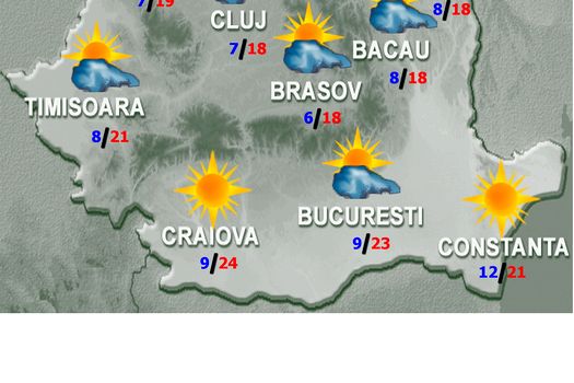 Vremea se va menţine caldă în sudul şi sud-estul ţării, dar în restul teritoriului se va răci uşor faţă de ziua precedentă. Cerul va fi variabil, cu înnorări temporare în Maramureş, Transilvania, Moldova, Dobrogea şi în nordul Munteniei, unde izolat se vor semnala ploi slabe de scurtă durată. În nordul Carpaţilor Orientali la peste 1800 m, trecător vor fi posibile precipitaţii mixte. Vântul va avea intensificări cu precădere în sud-vest, centru şi nord-est, iar în zona montană înaltă, mai ales a Carpaţilor Meridionali, va sufla tare. Temperaturile maxime se vor încadra între 15 şi 25 de grade, cu cele mai ridicate valori în Lunca Dunării, iar cele minime vor fi cuprinse între 3 grade în depresiuni şi 12 grade pe litoral.