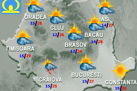 Valorile termice vor fi în creştere, în majoritatea regiunilor, dar cu precădere în cele sudice şi de sud-est, unde local vremea va deveni călduroasă. Instabilitatea atmosferică, ce se va manifesta prin înnorări, temporar accentuate, averse şi cu caracter torenţial, descărcări electrice şi intensificări de scurtă durată ale vântului, va cuprinde treptat, mai ales din a doua parte a zilei, vestul, nordul şi centrul ţării, precum şi zonele montane. În restul teritoriului, astfel de fenomene vor fi pe arii mai restrânse, noaptea. Se vor înregistra cantităţi de apă mai însemnate şi izolat va cădea grindină. Temperaturile maxime se vor încadra între 25 şi 33 de grade, cu cele mai ridicate valori în Lunca  Dunării, unde vor crea din nou disconfort. Temperaturile minime vor fi cuprinse între 11 şi 21 de grade.