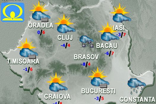 Cerul va fi variabil, cu înnorări şi pe arii restrânse precipitaţii slabe, predominant sub formă de ninsoare, mai ales ziua, în Maramureş şi în zona Carpaţilor Orientali. Vântul va sufla slab şi moderat, cu intensificări la munte, cu rafale ce pot depăşi 50 km/h pe creste, unde va spulbera zăpadă. Temperaturile maxime vor fi cuprinse în general între 2 şi 9 grade, iar cele minime, mai scăzute decât în noaptea precedentă, se vor încadra de la -13…-11 grade în estul Transilvaniei până în jur de 2 grade în Dealurile de Vest.