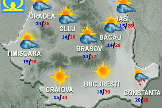 În jumătatea de nord a ţării vor fi înnorări temporare şi ploi de scurtă durată, posibil însoţite de descărcări electrice, local în Maramureş şi zona montană şi pe arii mai restrânse în Transilvania, Moldova şi Crişana. În restul teritoriului, cerul va fi variabil, iar ploile se vor semnala cu totul izolat. Vântul va sufla slab şi moderat, cu intensificări trecătoare, mai ales la munte. Valorile termice vor fi uşor mai coborâte decât cele normale pentru a doua decadă a lunii iulie în nordul şi centrul teritoriului, iar în rest vor fi apropiate de mediile multianuale. Astfel, maximele vor fi cuprinse între 19…20 de grade în Maramureş şi 30…31 de grade în Lunca Dunării, iar minimele se vor încadra între 8 şi 18 grade, mai ridicate pe litoral până la 21 de grade.
