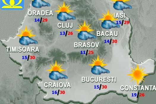 Temperaturile maxime se vor încadra între 24 şi 31 de grade, iar cele minime vor fi cuprinse între 7 grade în depresiunile Carpaţilor Orientali şi 19…20 de grade pe litoral. În zonele joase, dimineaţa şi noaptea vor fi condiţii de ceaţă.