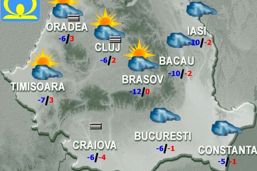 Vremea se va menţine rece în cea mai mare parte a ţării, geroasă dimineaţa şi noaptea, mai ales în Transilvania. Cerul va fi variabil, cu înnorări ziua în regiunile extracarpatice, iar noaptea mai ales în vest şi nord-vest şi izolat se vor semnala fulguieli trecătoare sau burniţă. Îndeosebi dimineaţa şi noaptea se va semnala ceaţă, asociată cu depunere de chiciură, local în centrul ţării şi pe arii restrânse în rest. Cu totul izolat vor fi condiţii de polei. Vântul va sufla slab şi moderat, cu unele intensificări în Banat şi Moldova. Temperaturile maxime se vor încadra între -4 grade în Oltenia şi estul Transilvaniei şi 6 grade în Dealurile de Vest, iar cele minime vor fi cuprinse între -14 şi 0 grade, mai scăzute în depresiunile Carpaţilor Orientali, până spre -18 grade.
