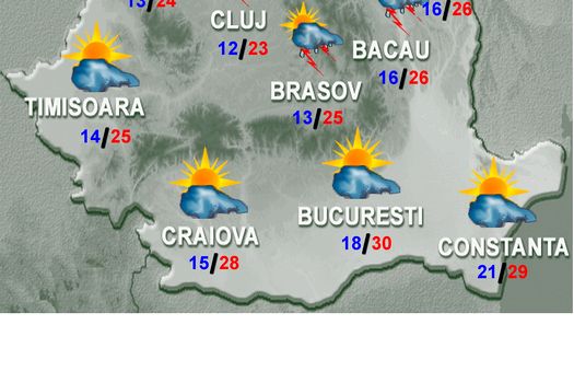 Vremea va fi în general instabilă. Temporar înnorările vor fi accentuate şi se vor semnala averse şi descărcări electrice în cea mai mare parte a ţării. Îndeosebi în sudul şi sud-estul teritoriului, precum şi în zona montană, vor fi condiţii de grindină, iar cantităţile de apă vor fi mai însemnate. Vântul va avea unele intensificări în regiunile estice şi în extremitatea de sud-vest, dar trecător şi în restul teritoriului în timpul ploilor. Temperatura aerului va avea valori uşor mai scăzute decât cele normale pentru această perioadă în cea mai mare parte a ţării, cu maxime ce se vor încadra între 18 şi 27 de grade şi minime între 9 şi 20 grade.