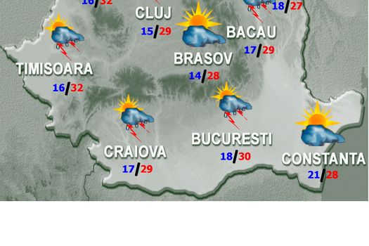Vremea se menţine în general instabilă. Ziua, cerul va prezenta înnorări temporar accentuate şi se vor semnala averse, însoţite de descărcări electrice, în zonele de deal şi de munte, local în sudul, centrul ţării şi pe arii mai restrânse în celelalte regiuni. Noaptea, astfel de fenomene se vor semnala în jumătatea de est a teritoriului şi izolat în rest. Cantităţile de apă, izolat, vor fi însemnate şi vor fi condiţii de grindină. Vântul va avea intensificări în est şi la munte, dar trecător şi în restul ţării, în timpul ploilor. Valorile termice rămân apropiate de cele normale pentru această perioadă, cu maxime cuprinse între 24 de grade în depresiuni şi 32 de grade în vest. Temperaturile minime se vor situa între 11 şi 22 de grade.