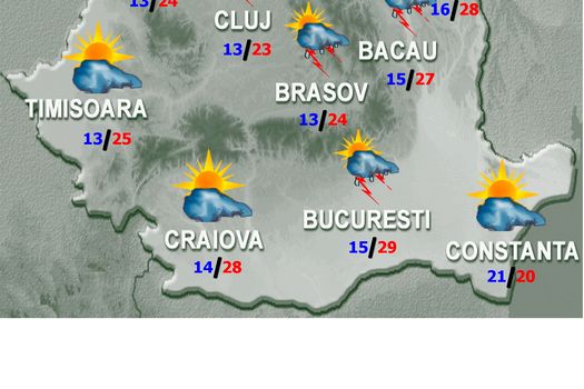 Vor fi condiţii de grindină, iar cantităţile de apă vor depăşi izolat 25…35 l/mp. În restul teritoriului cerul va fi variabil, cu înnorări trecătoare ziua în regiunile vestice, unde pe spaţii restrânse vor fi ploi slabe de scurtă durată. Temperaturile maxime se vor încadra între 20 de grade în Dealurile de Vest şi 32 de grade în Dobrogea, iar cele minime între 11 şi 19 grade, mai ridicate pe litoral şi în deltă, dar şi mai scăzute în depresiuni.