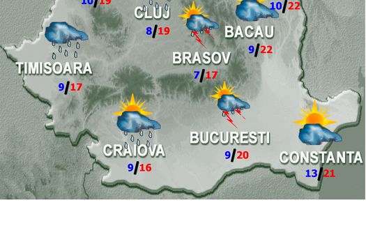 Vremea va fi instabilă. Cerul va fi temporar noros şi pe arii relativ extinse se vor semnala averse şi descărcări electrice. Izolat cantităţile de apă vor depăşi 15…20 l/mp îndeosebi în estul Carpaţilor Meridionali precum şi în zona Subcarpaţilor de Curbură. Vor fi condiţii de grindină, iar la altitudini de peste 2000 m, trecător precipitaţiile, slabe cantitativ vor fi şi sub formă de lapoviţă şi ninsoare. Vântul va prezenta unele intensificări ziua, apoi treptat va diminua în intensitate. Temperatura aerului va marca o uşoară creştere faţă de ziua anterioară.