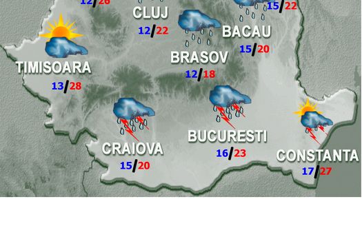 În jumătatea de sud-est a ţării şi în toată zona montană vor fi înnorări accentuate, averse care vor avea şi caracter torenţial, descărcări electrice şi grindină. Cantităţile de apă vor depăşi 25…35 l/mp şi pe arii restrânse, în Oltenia şi Muntenia, 50…70 l/mp. În restul teritoriului, înnorările vor fi temporare, ploile se vor semnala pe spaţii mai mici şi vor fi în general slabe cantitativ. Vântul va sufla slab şi moderat, temporar cu intensificări în regiunile vestice, sud-estice, la munte şi local în restul teritoriului. Temperaturile maxime se vor încadra, în general, între 18 şi 28 de grade, iar cele minime între 10 şi 19 grade.