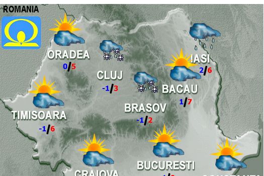 În nordul, centrul şi estul ţării vor mai fi înnorări, mai ales în cursul zilei, dar numai izolat vor fi precipitaţii slabe, fulguieli în Carpaţii Orientali şi precipitaţii mixte în Maramureş, estul Transilvaniei şi nordul Moldovei. În restul teritoriului, cerul va fi variabil. Vântul va sufla slab şi moderat cu intensificări pe crestele montane, spulberând zăpada. Temperaturile maxime se vor încadra între 2 şi 12 grade, iar cele minime între -11…-10 grade în depresiunile Carpaţilor Orientali şi 4…5 grade pe litoral. Pe arii restrânse va fi ceaţă, în special noaptea.