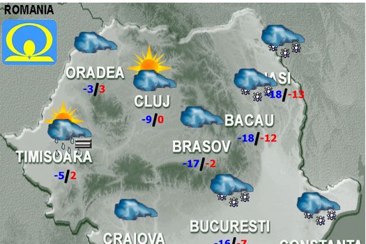 Vineri, vremea se va menţine rece în cea mai mare parte a ţării, geroasă în special noaptea şi dimineaţa în sud, est şi local în centru. Cerul va fi mai mult noros în regiunile extracarpatice, unde pe arii restrânse va ninge slab şi, mai ales în a doua parte a intervalului, local va fi ceaţă asociată cu chiciură. În vest, nord-vest şi centru înnorările vor fi temporare, dar va fi ceaţă, posibil asociată izolat cu burniţă, favorizând poleiul. Vântul va avea intensificări în regiunile sudice, nord-estice şi temporar în rest, cu viteze mai mari în sudul Banatului şi în zona montană, unde temporar va spulbera zăpada. Temperaturile maxime vor fi cuprinse între -15…-14 grade în Moldova şi 3…4 grade în Dealurile de Vest, iar cele minime se vor încadra între -20 de grade în Depresiunile Carpaţilor Orientali şi -2 g