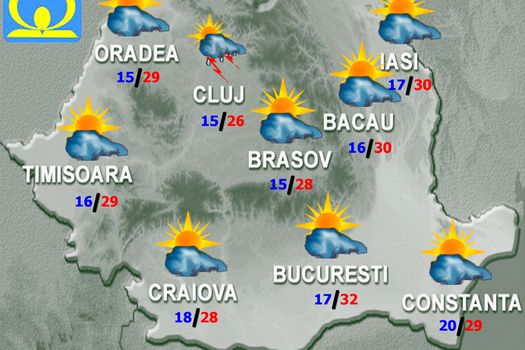 Vineri, în jumătatea de est a ţării şi la munte vremea va fi în general instabilă, cerul va prezenta înnorări temporar accentuate şi pe arii relativ extinse vor fi averse, descărcări electrice, intensificări de scurtă durată ale vântului care trecător pot lua aspect de vijelie şi izolat grindină. Ploile vor avea şi caracter torenţial, iar cantităţile de apă vor depăşi 20 l/mp şi izolat 50 l/mp. În restul teritoriului nebulozitatea se va reduce treptat, iar astfel de fenomene vor fi pe arii restrânse. Temperaturile maxime vor fi de la 22…23 de grade în regiunile nordice, până la 30…31 de grade în sudul ţării, iar cele minime se vor încadra, în general, între 10 şi 20 de grade.