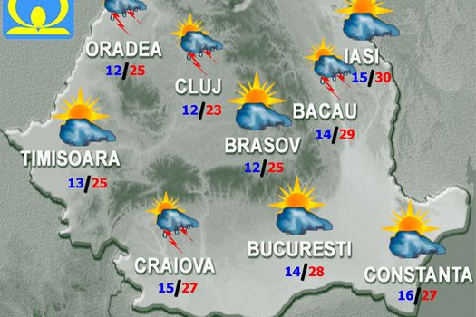 Vremea va fi instabilă. Cerul va fi mai mult noros şi pe arii extinse vor cădea averse, însoţite de descărcări electrice şi de intensificări de scurtă durată ale vântului. Pe spaţii restrânse, în special în jumătatea de est a ţării şi la munte cantităţile de apă vor fi însemnate şi vor fi condiţii de grindină. Temperaturile maxime vor continua să scadă, cu precădere în sudul şi în estul ţării şi se vor încadra între 17 şi 24 de grade, iar cele minime se vor situa între 9 şi 17 grade.