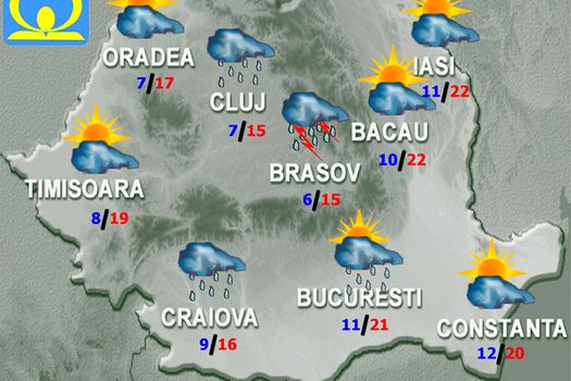 Luni, cerul va fi variabil, cu înnorări pe parcursul zilei, când vor fi condiţii de averse şi descărcări electrice. Vântul va sufla slab şi moderat. Temperatura maximă va fi de 20…21 de grade, iar cea minimă de 9…11 grade.