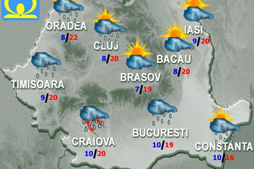 Cerul va avea înnorări temporare şi, cu precădere în timpul zilei, vor fi averse, însoţite şi de descărcări electrice şi intensificări de scurtă durată ale vântului, local în sud-vestul ţării şi în zonele de deal şi de munte şi pe arii restrânse, mai ales după-amiaza, în restul teritoriului. Izolat vor fi condiţii de grindină. Temperaturile maxime vor fi cuprinse între 16 grade pe litoral şi în depresiuni şi 22…23 de grade, local, la câmpie, iar cele minime se vor situa între 4 şi 12 grade. Dimineaţa şi noaptea, în sud-est, izolat va mai fi ceaţă.