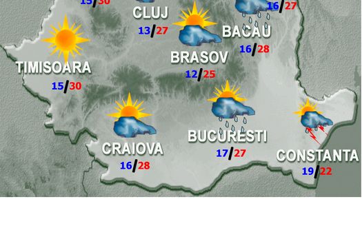 Izolat va cădea grindină. În restul teritoriului cerul va fi variabil, izolat vor fi ploi de scurtă durată, iar vântul va sufla slab şi moderat. Temperaturile maxime se vor încadra între 21…22 de grade pe litoral şi 30…31 de grade în Câmpia şi Dealurile de Vest; minimele termice se vor situa între 9 şi 19 grade.