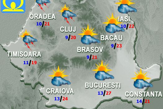 În timpul zilei vor fi averse, descărcări electrice şi intensificări de scurtă durată ale vântului în zona montană, precum şi în vest, centru şi sud-est şi pe arii restrânse în rest, iar noaptea, astfel de fenomene se vor semnala cu precădere în jumătatea de nord a ţării. Izolat va cădea grindină, iar cantităţile de apă vor depăşi 10…15 l/mp. Temperaturile maxime vor fi cuprinse între 18 şi 27 de grade, iar cele minime se vor situa între 5 şi 15 grade.
