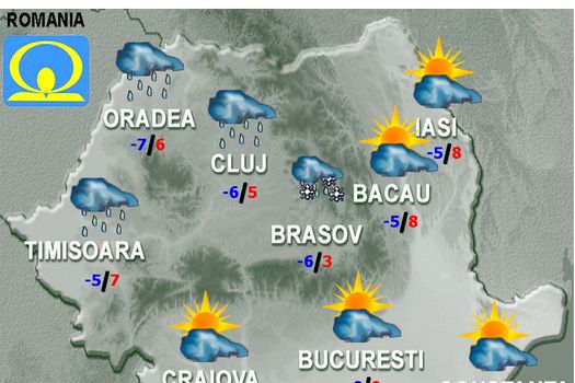 Valorile termice vor scădea semnificativ, astfel că vremea va deveni rece in toată tara, geroasă noaptea in majoritatea zonelor. Temperaturile maxime se vor incadra intre -8 si 2 grade, usor mai ridicate doar in Lunca Dunării, iar cele minime se vor situa intre -15 si -3 grade, mai coborate in depresiuni, pană in jurul a -20 de grade in estul Transilvaniei.