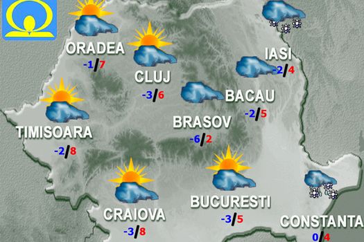 În restul ţării, vor fi înnorări mai ales pe timpul zilei, pe arii restrânse precipitaţii slabe, mixte, iar regimul termic va fi caracterizat de valori normale pentru această dată. Vântul va sufla slab şi moderat, cu intensificări pe crestele montane. Temperaturile maxime vor fi cuprinse între 1 şi 10 grade, iar cele minime se vor încadra între -10…-8 grade în depresiunile Carpaţilor Orientali şi 1…2 grade în Dealurile de Vest. Dimineaţa şi noaptea, izolat în zonele joase va fi ceaţă.