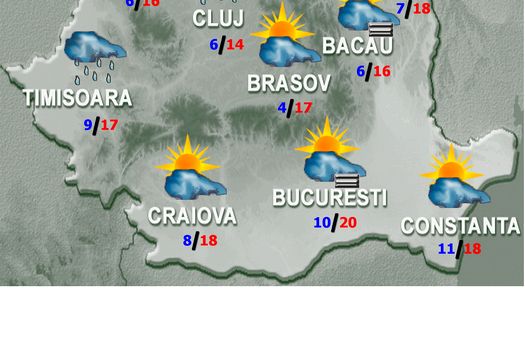 În regiunile vestice şi nord-vestice cerul va fi noros, temporar va ploua, iar cantităţile de apă vor putea depăşi, cu totul izolat, 20…25 l/mp. În restul teritoriului cerul va fi variabil, ploi sau burniţă vor fi pe spaţii mici, iar dimineaţa şi noaptea, local, se va semnala ceaţă. Vântul va sufla în general moderat, cu intensificări pe parcursul zilei, în vestul, nord-vestul şi nord-estul ţării, unde (mai ales în Banat) la rafală se vor atinge, pe arii restrânse, 55…60 km/h şi la munte, unde pe creste vor fi viteze de peste 80…85 km/h. În rest, vântul va sufla slab şi moderat. Temperaturile maxime se vor încadra între 13 grade în estul Transilvaniei şi 21 de grade în Lunca Dunării, iar cele minime se vor situa între 4 şi 11 grade, mai scăzute în depresiuni, spre 1 grad.