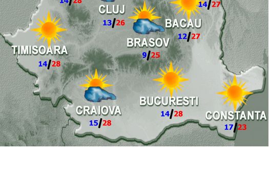 Temperaturile maxime se vor încadra între 23 şi 30 de grade, iar cele minime vor fi cuprinse între 5…7 grade în depresiunile Carpaţilor Orientali şi 18 grade pe litoral. În zonele joase, dimineaţa şi noaptea, pe arii restrânse va fi ceaţă.