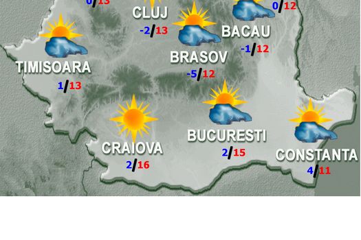 Temperaturile maxime se vor situa între 8…9 grade în Delta Dunării şi în depresiuni şi 17…18 grade în Oltenia, iar cele minime, în general, între -6 şi 3 grade. Izolat, în zonele joase, dimineaţa şi noaptea va fi ceaţă.